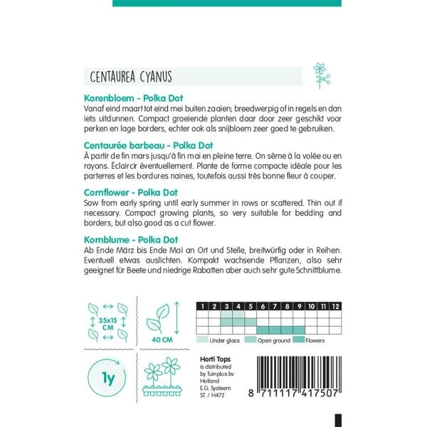 Deze prachtige snijbloemen zijn zeer geschikt voor perken en lage borders! Het zijn compact groeiende planten met verschillende bloemkleuren in roze, lila en blauwe tinten. De korenbloem bloeit van juni tot oktober.