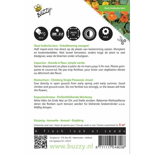 Klimmende, eenjarige Oost-Indische kers in allerlei fijne tinten en met enkele bloemen. De planten klimmen langs een steun tot 2 meter hoog en meer. De bloemen zijn zelfs eetbaar.