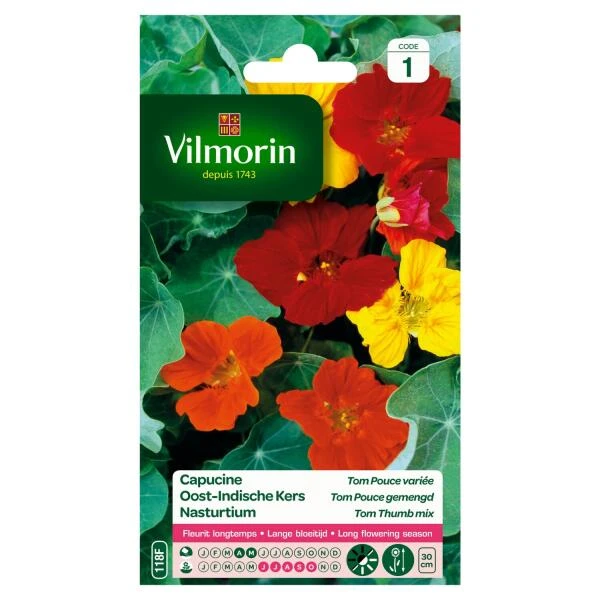 Compacte plant Oost-Indische kers Tom-Pouce met felgekleurde bloemen en een dichte bladgroei beperkt de groei van onkruid. Combineer met dagschone, goudbloem en tagetes.