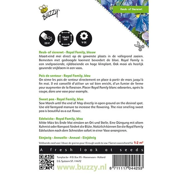 De siererwten uit de ‘Royal Formule’ reeks behoren tot de heerlijk geurende eenjarige Lathyrus typen. Ze bloeien zeer vroeg en geven een lange dikke bloemsteel met veel grote, blauwe bloemen. Uitstekende snijbloemen.