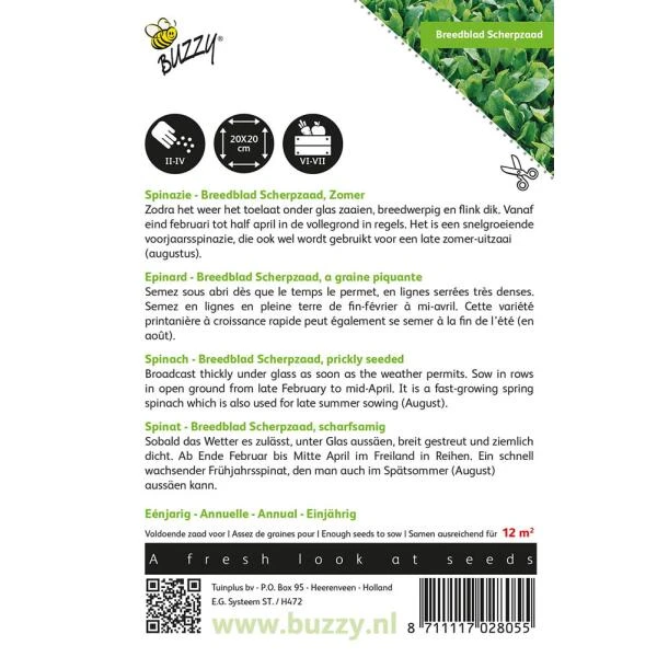 Spinazie Breedblad Scherpzaad is geschikt voor de voorjaarsteelt maar kan ook gebruikt worden voor een late zomerteelt of herfstteelt. Spinazie is een gezonde en ijzerhoudende groente die zowel rauw als gestoofd lekker is. Het malse blad smaakt uitstekend.
