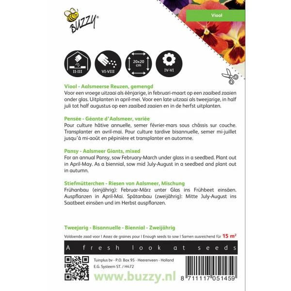 Dit mengsel grootbloemige violen van de ‘Hollandse Reuzen’ groep, kunnen zowel een- als tweejarig worden geteeld. De planten worden ca. 20 cm. hoog. Ze voldoen hierdoor uitstekend in randen, perken, borders en bloempotten en bloembakken.